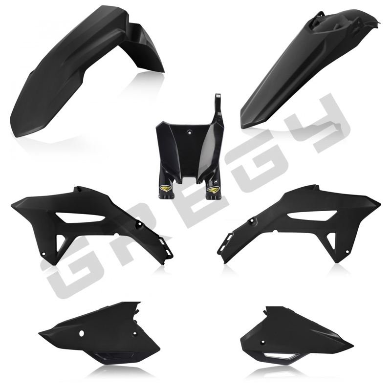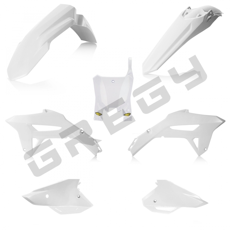 Sada obsahuje přední blatník, zadní blatník, kryt nádrže, boční číselné tabulky a přední číselnou tabulku Cycra.