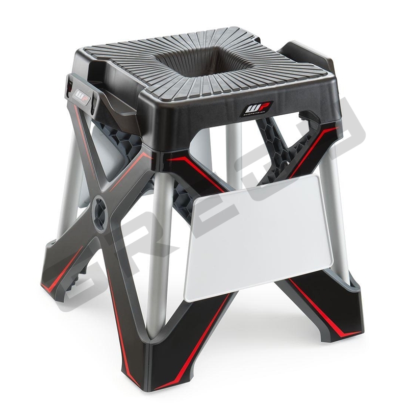 Pevný stojan WP s pogumovaným vrchem a přihrádkami na odkládání dílů během servisu motocyklu.